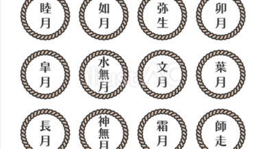 和暦の月名を丸い縄フレームでまとめたアイコン素材です。和風カレンダーや季節の案内、ブログ挿絵などに使いやすいデザインです。